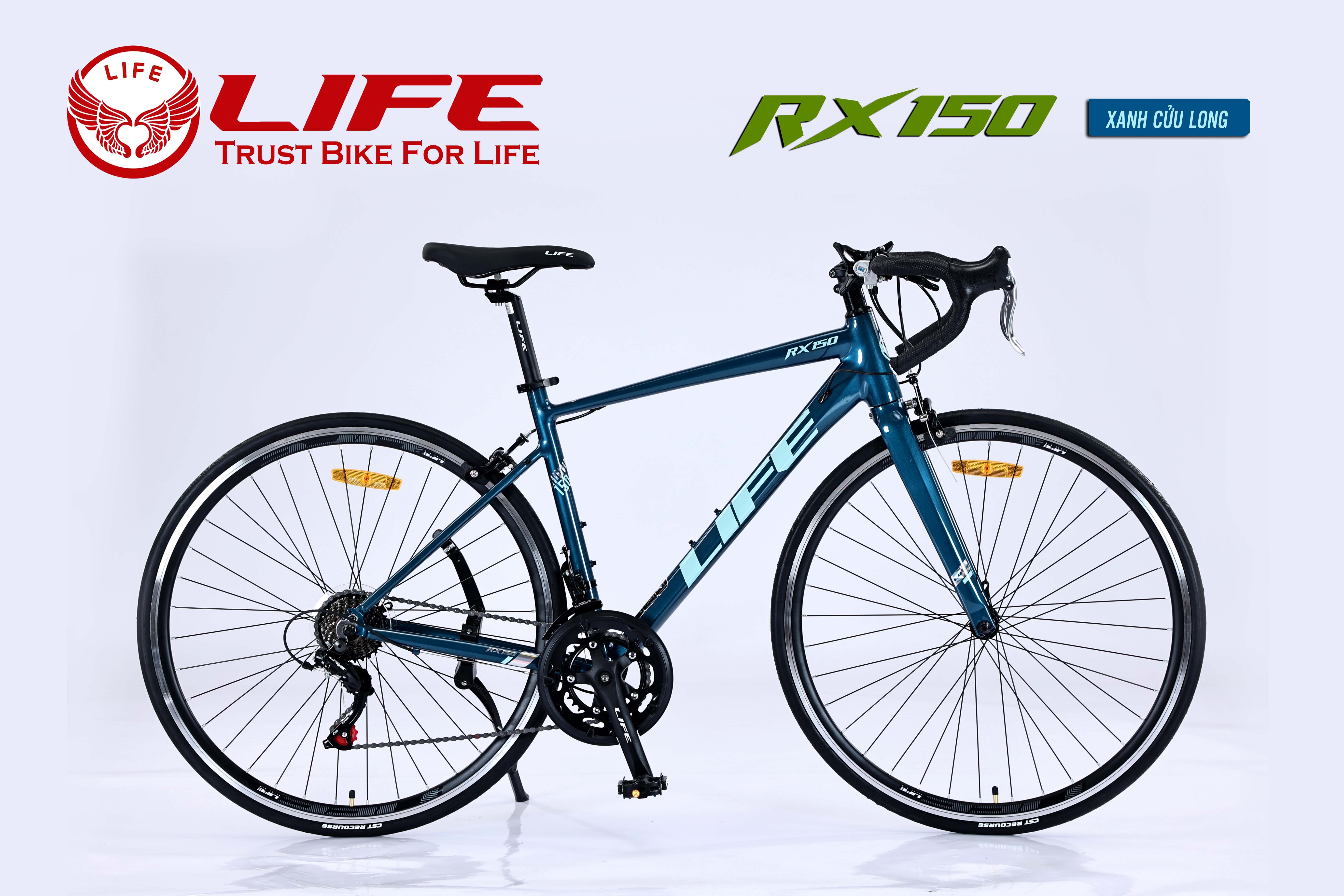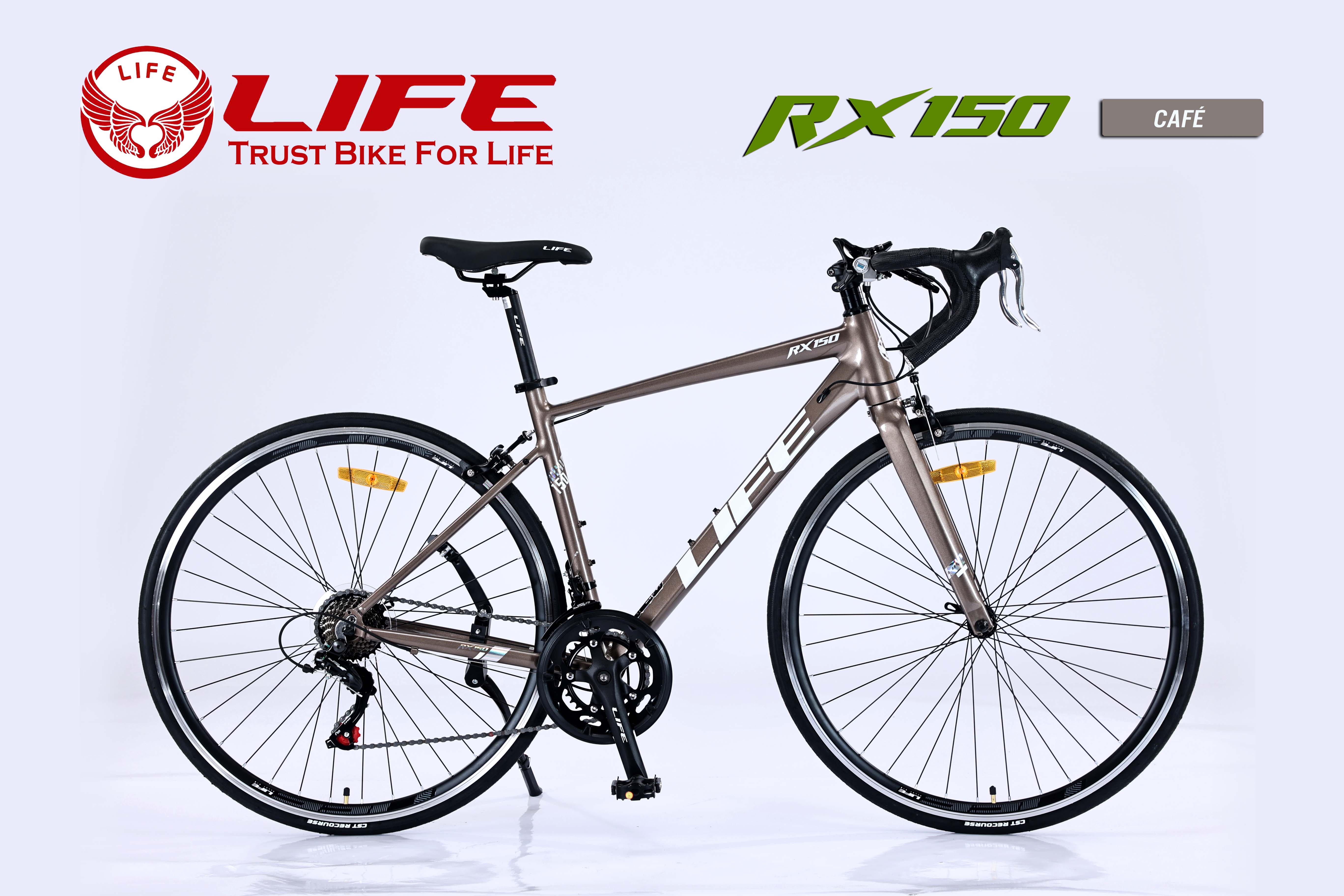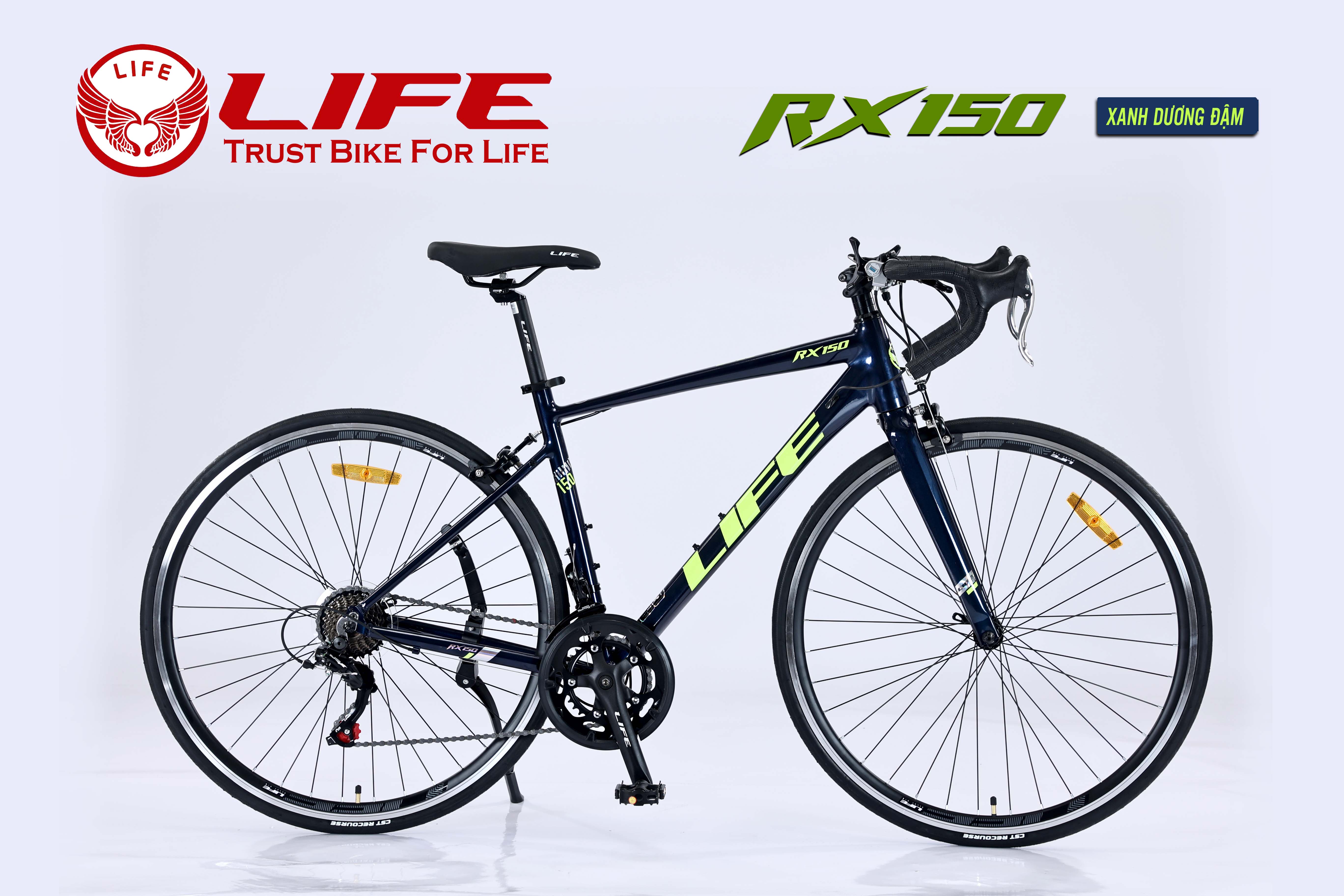 Xe đạp đua LIFE RX150 Với cấu hình sử dụng Nhôm nhẹ, thiết kế kiểu dáng khí động học không mối hàn, dây đi âm khung, cực kỳ đẹp. Bộ truyền động SHIMANO 2x7 tốc độ. Đùi đĩa nhôm, moayer bạc đạn, phanh V, vành nhôm bản đẹp cao 3cm vô cùng thời trang. LIFE RX150 khẳng định là quán quân cho phân khúc xe đua khung Nhôm với mức giá cực kỳ tốt, một chi phí rất tiết kiệm - người dùng sở hữu 1 chiếc xe với hình thức cực kỳ đẹp, cấu hình SHIMANO rất tốt, thực sự RX150 không có đối thủ trong phân khúc này.